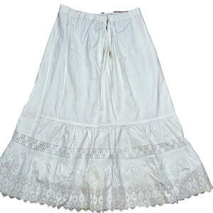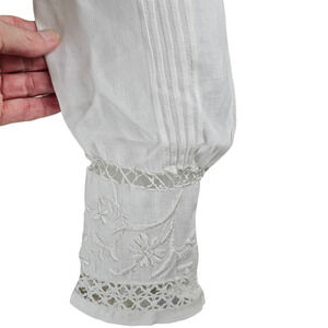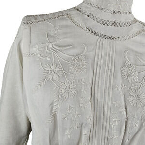 Stunning white linen embroidered skirt and bodice with lace inserts (fagotting), pintucks, and floral embroidery.