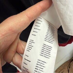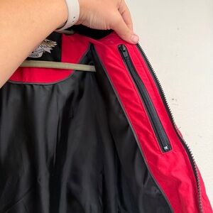 This Harley Davidson is an excellent condition, the only sign of wear is on the zipper pulls. The hood zips on and off easily and the lining is an excellent condition with a hidden zipper pocket. There is a photo of the materials and fabric, the interior is Feather and down, so it will be very warm. It is very soft & squishy to the touch with quilt work type stitching. This is a classic piece, slightly vintage.