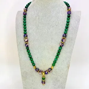 Matte malachite beads with dark blue cloisonné and gold plated findings