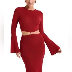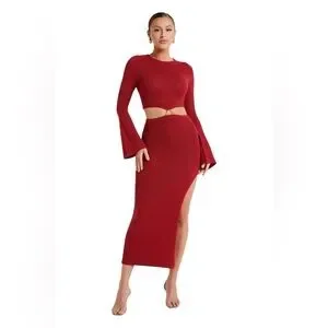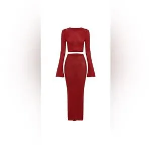 Elegant red maxi dress. Features long sleeves and side cut-outs. Perfect for evening wear.