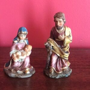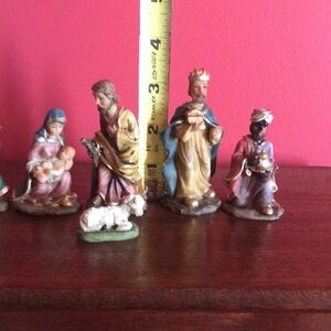 Petite Holy Night nativity scene featuring baby Jesus being held by Mary, Joseph, the three kings, a lamb and a wooden manger. This vintage set was made by Giftco.
