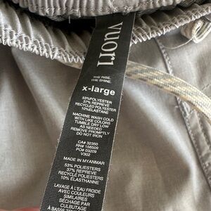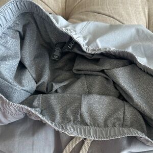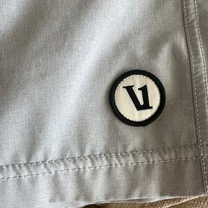 Vuori men's athletic shorts in silver gray. Features elastic waistband and drawstring. Perfect for active wear.