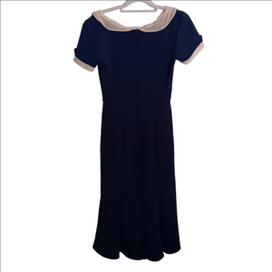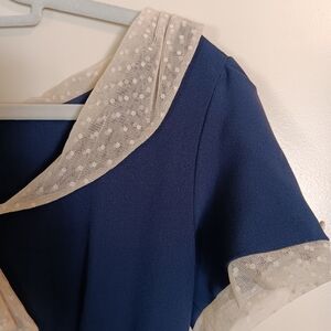 Elegant navy blue dress in great pre-owned condition,featuring cream lace accents. Perfect for any occasion. This dress is the epitome of class.