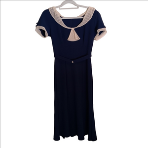 Stop Staring Raileen Navy & Cream 1940s Style Midi Dress Form Fitting Cap Sleeve