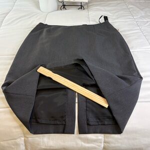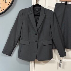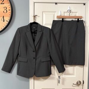 Classic and professional 2-piece skirt suit set in charcoal gray.