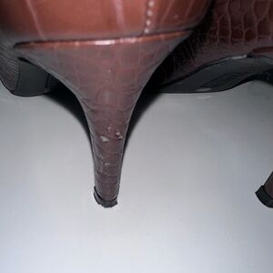 These Alfani heels feature a rich chocolate brown leather with a sophisticated croc-embossed pattern. The pointed toe and medium-height heel create a classic silhouette, perfect for business or formal occasions.