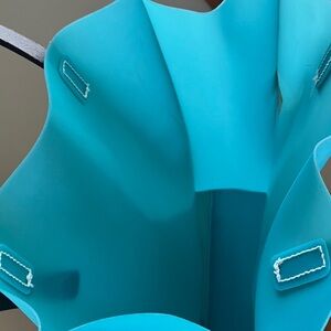 Chic Robin egg Blue open tote with brown leather straps. Ideal for daily use. Stylish and versatile.