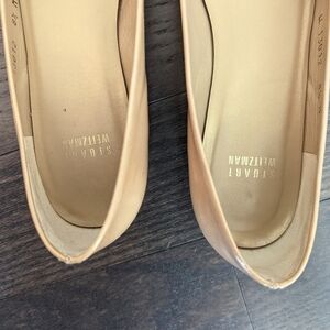 Tan pair of Stuart Weitzman pointed toe flats with a small bow and patent leather with rubber soles.