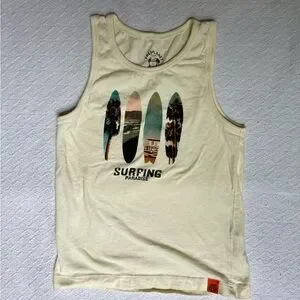 This stylish tank top set for kids features a Surfing Paradise design. The cream tank top showcases a fun surfing graphic, while the white striped tank adds a classic touch. Perfect for sunny days and beach adventures.