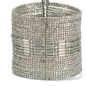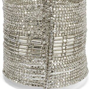 SILVER BEADED STATEMENT BRACELET: Handmade with silver beads in a 2.25 inch cuff bracelet. Features eye catching silver shimmering beads. Easy to slip on and off. 18cm round, 1 size fits most.