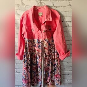 ONE OF A KIND UNIQUE CREATION. Upcycled pink denim duster. Fits sizes small to large. Ptp is 21 and length is 37. Perfect when paired with your favorite tee and jeans.