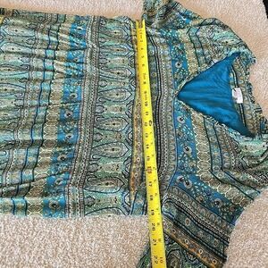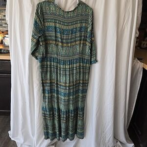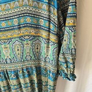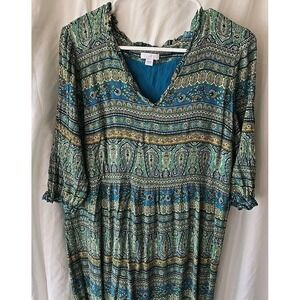 J Jill Long Dress 3/4 Sleeve V-neck Green Blue Paisley Size L Boho Cottagecore