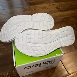 Brand new, in box. Only tried on. Bought for my mother and she found them too small. OOFOS comfort in 4 ways stretch woven canvas-like material upper. OOFOS recommends to size up half a size in these.