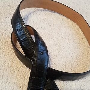 Stylish black leather belt with ornate silver buckle. Perfect for adding elegance.