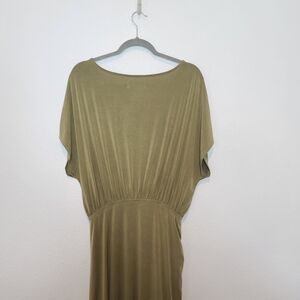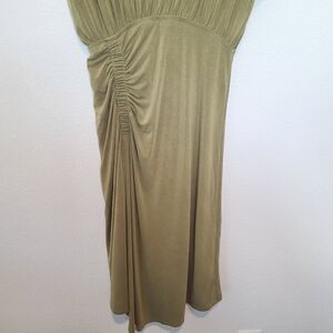Anthropologie Ruched Modal Maxi Dress in a soft green-tan tone. Features a flattering gathered waist, draped silhouette, and elegant asymmetrical ruching. Perfect for date night, brunch, special events, or cocktail evenings. Beautiful flow and ultra-soft modal blend.