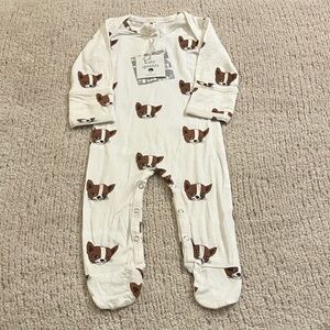 This one piece with cute brown dog design is brand new and in excellent condition. It is 96 percent bamboo and 4 percent Lycra.