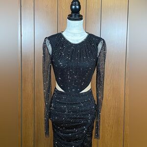 This shimmering fishnet Diamante midi-dress gathers at the hip in a ruched design. Cut with a side slit, this style features sheer long sleeves and mesh cut-outs at the waist.