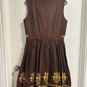 Handmade brown Dirndl with embroidered flowers. Approximate size is 10-12. Front zipper. Selling at a discount-needs a good ironing. From a smoke free home. Armpit to Armpit 19 in, Waist 16 in. laid flat.
