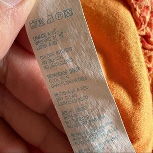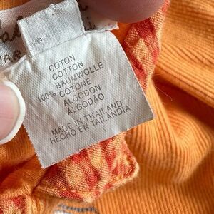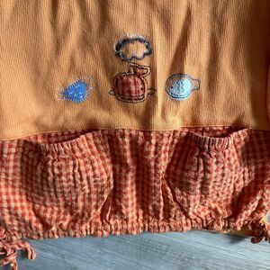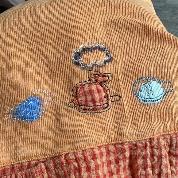 Adorable orange ribbed knit upper with woven orange gingham seersucker bottom & Peter Pan collar. Image on front is printed & embroidered with a little whale in the middle & a bird on one side, fish on the other. I have no idea of the meaning but it’s really cute & artsy.