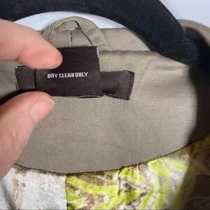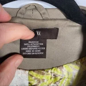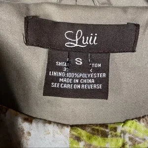 LUII Women’s coat. Ruffles and buttons up the front. Zips closed. 3/4 sleeves. Small. Coat has double collar. No cuff on sleeves. Two front pockets and waist tie. Very “girly”. Excellent Used Condition.