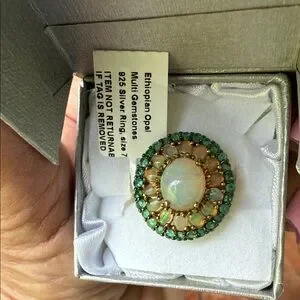 This exquisite ring showcases a mesmerizing opal center, beautifully accented by lush green Apatite gemstones. A perfect piece to elevate your style.