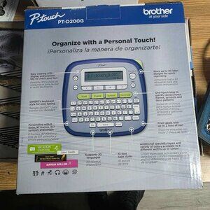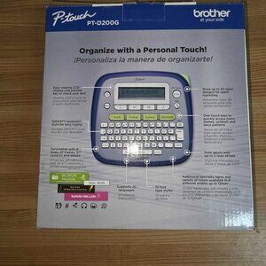 This is a barely used, like-new Brother P-Touch PT-D200G label maker. It comes in its original box and includes both of the original starter tapes. The clear sample tape has been opened and used only for a test print, while the black-on-white tape is still sealed. The unit is in excellent, pristine condition and is ready to help you organize your home or office.