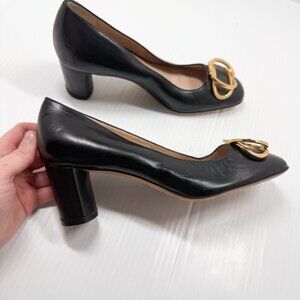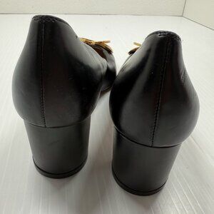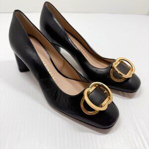 Stuart Weitzman Anicia 60 Black Leather Pumps Gold Buckle Size 5.5 Block Heel