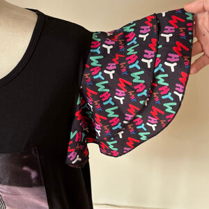 This women's black short-sleeve top, size XL by WHY DRESS, features a prominent graphic print on the front of legs adorned with pearl-embellished pants and studded rhinestone high heels. The short sleeves are designed with multi-layered ruffles, showcasing a vibrant, repeating "WHY" text pattern in various colors.