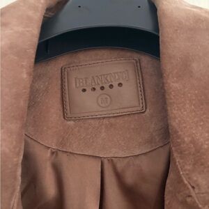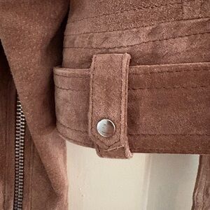 Stylish tan suede jacket with silver hardware. Features a classic biker design. Ideal for versatile wear. Some light wear on rivets.