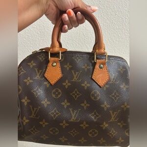 Chic Louis Vuitton satchel with iconic monogram. Features pink and brown handle details.