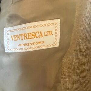 Ermenegildo Zegna blazer 44L from the fine mens store, Ventresca of Doylestown. Beautiful fine wool. Perfect jacket for now, fall or business casual. Light tan color with faint light blue and mustard in background. Good preloved condition.