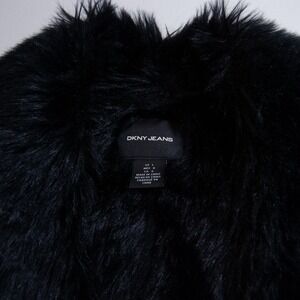 Keywords: DKNY Jeans, black vest, faux fur vest, sleeveless jacket, women's vest, faux suede vest, collar vest, layered vest, open front vest, black faux fur, sleeveless jacket women, womens black vest, large vest