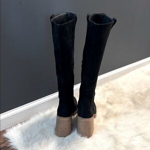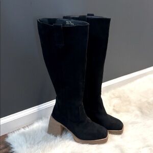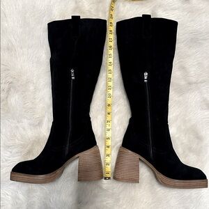 Step out in style with these elegant black knee-high boots. Perfect for any occasion, these boots offer both comfort and sophistication. Faux suede. New without the box