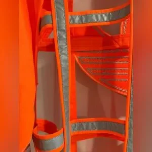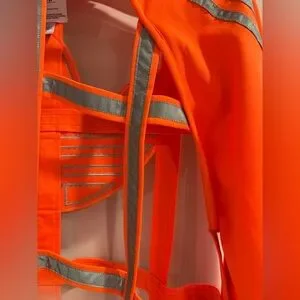 Safety orange, with silver reflective striping, long sleeve, zip up, elastic waist, elastic collar