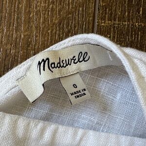 Linen and so soft and flowy. No stains or defects. Appears sheer in the photo, but when worn with a nude bra it is undetectable. I have no idea why the photo looks yellow, it is pure white in like new condition.