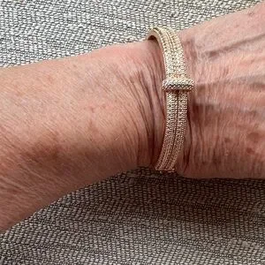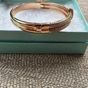 Stylish gold-tone bracelet by Park Lane. Features intricate design with small pave faux stones. Perfect for any occasion.
