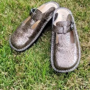 Alegria, Brown Tooled Patent Patterned Women's Shoes 8.5