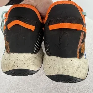 The product is a pair of Nike PG 4 Digi-Camo sneakers in size 9.5. These athletic shoes feature a vibrant orange color with a mesh upper material for breathability. Released in 2020, this model belongs to the Nike PG product line and is designed for men who appreciate colorful and stylish footwear. The unique digi-camo design adds a modern touch to the classic sneaker style, making it a trendy choice for sports or casual wear.