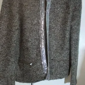 Chic charcoal cardigan with shimmering silver trim. Ideal for layering with elegance.
