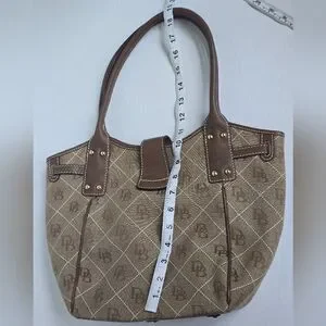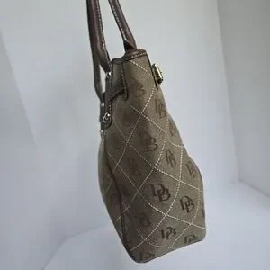 beautiful vintage Dooney & Bourke with the signature brown DB on olive green fabric. Dark brown leather trim and handles. in great shape and great wear!
