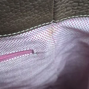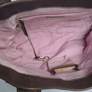 damage- please see pictures. although purse has seemingly no wear or tears, there are some marks along the brown exterior leather trim like a marker. also, one small brown spot on the interior (also pictured).