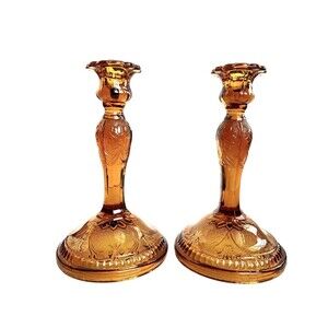 Vtg CandleSticks Tiara Amber Indiana Glass Sandwich1940 8.5"candle holder set 2