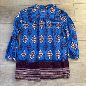 This vibrant boho-inspired blouse is a perfect mix of comfort and style. Featuring a bold blue base with geometric patterns in burgundy, white, and black, it has a relaxed fit with a flattering empire waist and button-down front. The 3/4 sleeves and lightweight fabric make it easy to wear year-round—pair it with jeans, shorts, or leggings for an effortlessly chic look. Great for casual days, vacations, or adding a pop of color to your everyday wardrobe.
