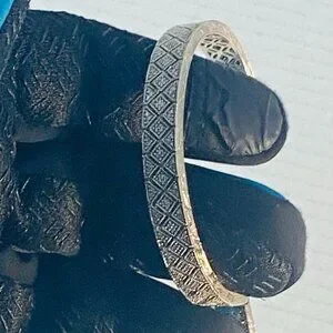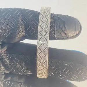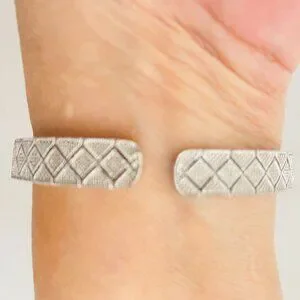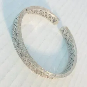 A study in symmetry and subtle strength, this open-ended sterling silver cuff bracelet features a finely etched lattice of diamond motifs and crisscross lines—an homage to both ancient geometry and modern minimalism. Crafted in China and stamped ISP 925, it carries the quiet authority of genuine sterling silver, with a cool-toned gleam that catches light like whispered movement.