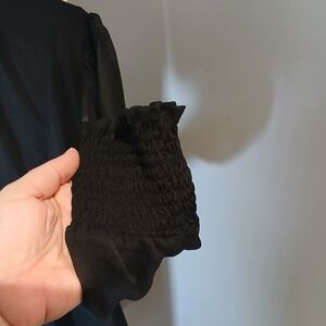 Sheer arms with elastic and ruffled wrist detail.