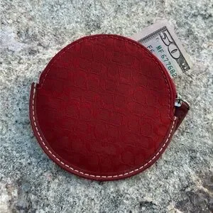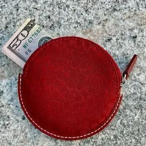 Stylish Coach red coin purse with zipper closure. Perfect for carrying small essentials. 4” x 4”