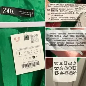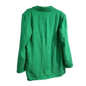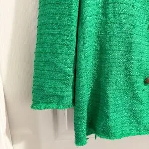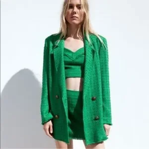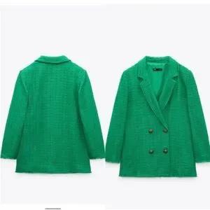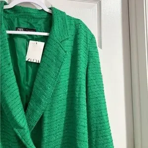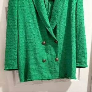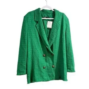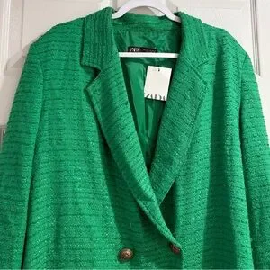 Zara Textured Double Breasted Tweed Jacket Blazer Longline Relaxed Fit in Green, Size Large. Chic and on trend blazer in the perfect green for fall. Longline blazer with notched lapel collar and long sleeves. Textured tweed, front double breasted button closure. Lined. Rich green color is flattering and matches with your fall favorite neutrals and jewel tones. Modern slightly oversized relaxed fit. Poly/viscose/cotton/elastane fabric.