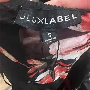Elegant black dress with vibrant red floral pattern. Halter neck design. Flowing skirt for a graceful look. Tag has been removed, partial plastic “JLUXLABEL” tag remains,never worn.