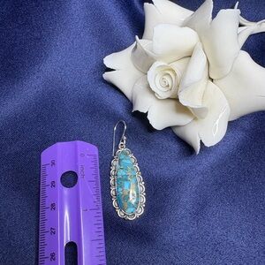 Gorgeous blue turquoise with infused copper make up,the stones in these exquisite earrings! Set in. Quality 925 Sterling silver with an intricate Southwestern style frame around the stone make these a great addition to so many outfits! A must have for turquoise lovers and a great addition to any collection!