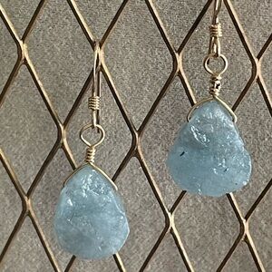These delicate handmade earrings showcase raw aquamarine stones, wire-wrapped in genuine sterling silver. With their soft, seafoam blue hue and organic shape, these earrings radiate calm and elegance. Lightweight and eye-catching—perfect for everyday wear or as a unique gift.